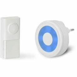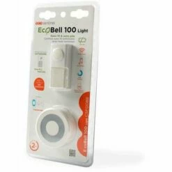 Carillon – Sans fil – Sans pile enfichable avec halo lumineux – EcoBell 100 Light – PortĂ©e 100 metres en champ libre – 25 mĂ©lodies – Bouton fonctionnant sans pile, rĂ©sistant a l’eau IP55 – Double signal de prĂ©sence : sonore et lumineux – FrĂ©quence 433,92 MHz – Porte-nom sur le bouton.