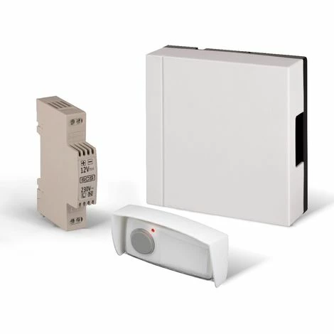 Le MecaBell Transfo est un carillon 2 fils et offre une mélodie. Le bouton poussoir avec porte étiquette et visiÚre de protection est inclus.