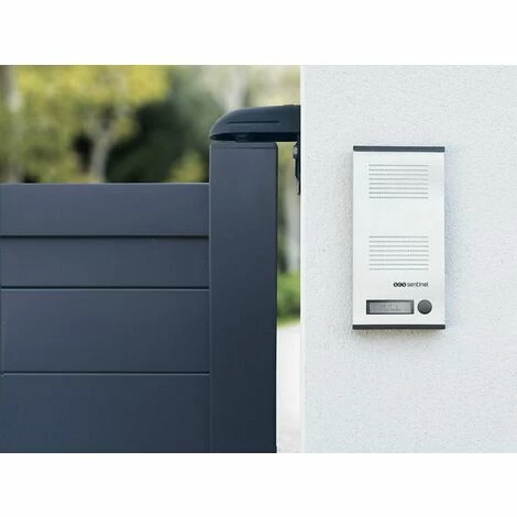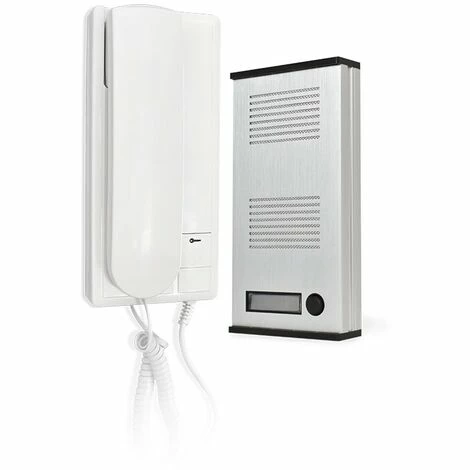Interphone audio 2 fils avec combinĂ© blanc dâintĂ©rieur et platine de rue audio en aluminium pour pose en applique. Porte-Ă©tiquette rĂ©tro-Ă©clairĂ© et transformateur intĂ©grĂ©s.